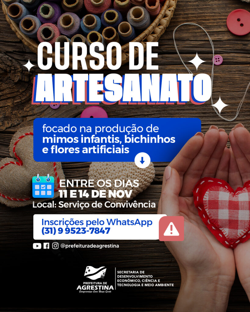A Prefeitura de Agrestina, por meio da Secretaria Municipal de Desenvolvimento Social e Direitos da Cidadania, está promovendo um curso gratuito de artesanato focado na produção de mimos infantis, bichinhos e flores artificiais, em parceria com a JC Flores. O curso, destinado a maiores de 18 anos, ocorrerá presencialmente entre 11 e 14 de novembro.