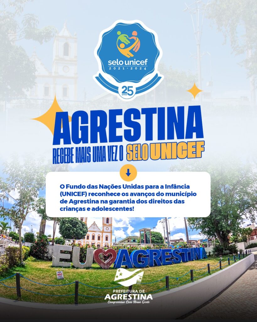 O município de Agrestina conquistou mais uma vez o Selo Unicef 2021-2024, uma certificação promovida pelo Fundo das Nações Unidas para a Infância (UNICEF), que reconhece o compromisso e os avanços significativos na proteção e promoção dos direitos de crianças e adolescentes.